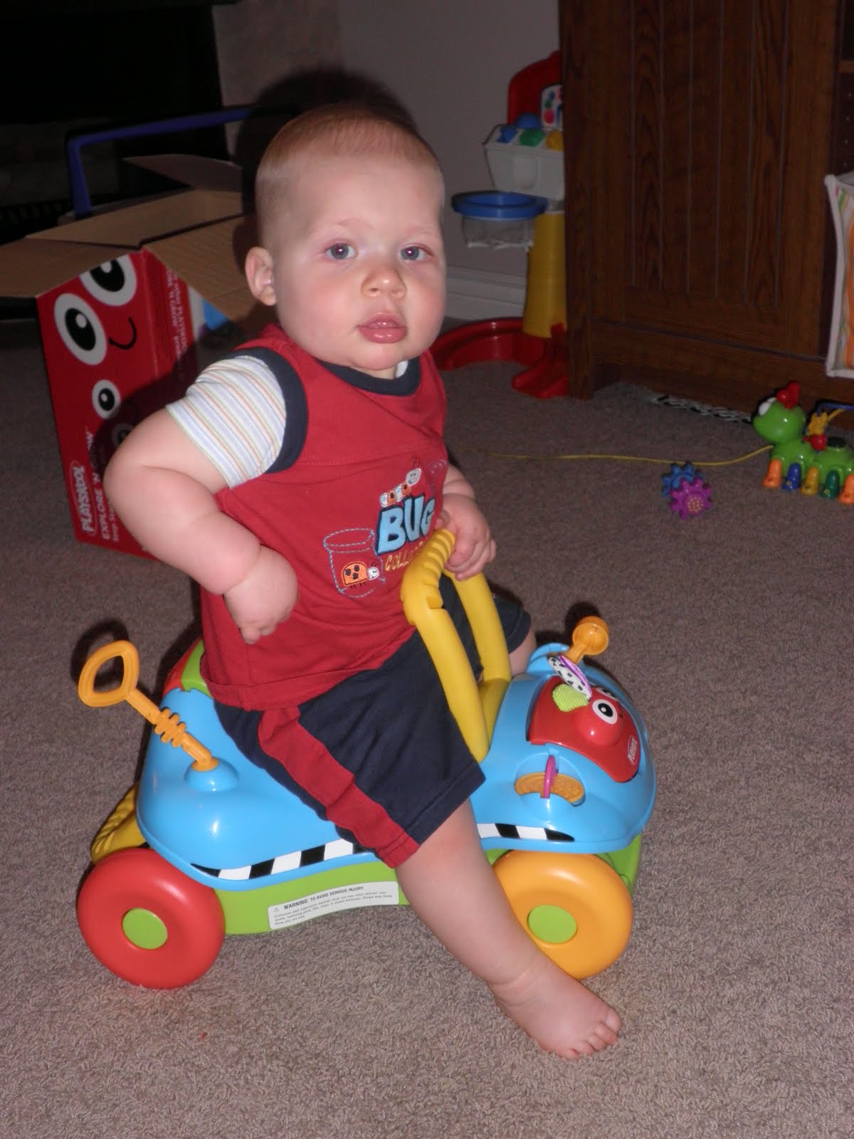 This handsome boy of ours is a handful! He finally learned how to crawl the real way and has done that most of the time. He only does the army crawl once in awhile. He is still building those leg muscles and hasn't started walking yet but he pulls up on EVERYTHING! He has started to move around holding furniture as well. He started to walk with one of those walker toys and does surprisingly well. He loves big people food and we dont even give him any baby food now. His favorite food is spaghetti! He transitioned easily to whole milk, but we do have to heat it up a little bit. We also started him on sippy cups and now he doesnt get any bottles. It was a very easy transition :) He loves to talk and sometimes I swear he says real words. He can say "more" or "mah" and he can also sign it which comes in handy. He is a smart kid and seems to figure out how to do things on his own. His favorite toys at the moment are doors (opening and closing them), blinds, air vent, and anything that makes noise. He is a kid that doesnt like to sit still so it makes for fun and busy days. He has four teeth now. Luckily his top teeth were no where near as dreadful as the bottom teeth. They are growing in fast and he looks super cute! This kid has an amazing grip! Other kids try to take toys away from him and he just holds on tight! Its funny. He sleeps amazing and his naps are still about 3 hrs long. He has started to get "stranger danger" and isn't so willing to just go to anyone anymore. He loves to be outside and loves to go on walks. Anyway.. we love him to pieces and can't believe how big he is and how fast this year went!